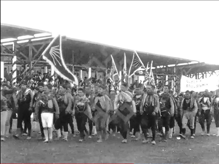 Hipodromda gerçekleşen törenlerde Gazi Mustafa Kemal Atatürk, şık giyimi ile dikkatleri üzerine çekmektedir. Siyah uzun etekli, bele değen yırtmaçlı ceket ve pantolonundan oluşan frak takım elbisesini giymekte; elinde ise şık bir siyah fötr şapka bulunmaktadır. Tüm gösteriyi ayakta izleyen Atatürk, her topluluğu şapkasıyla özel olarak selamlıyor. Topluluklar da Atatürk’e bakarak yürüyüşlerine devam ediyorlar.