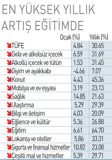 TÜFE’de en yüksek aylık artışlar %14.85 ile sağlık, %10.82 ile sigorta ve finansal hizmetler, %6.61 ile eğitim gruplarında görüldü. Gıda ve alkolsüz içeceklerde %6.59, ulaştırmada %5.29 ve konut, su, elektrik, gaz ve diğer yakıtlarda %4.43 artış yaşandı. Yıllık enflasyonun en yüksek olduğu gruplar ise %64.70 ile eğitim ve %45.36 ile konut oldu. Gıda ve alkolsüz içeceklerde %31.69, ulaştırmada %29.39 ve konut, su, elektrik, gaz ve diğer yakıtlarda %45.36 artış kaydedildi. Çekirdek enflasyon, 50 ay sonra %30’un altında kaldı.