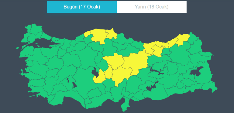 Meteoroloji, Yozgat, Sivas, Aksaray, Nevşehir, Kayseri, Rize, Artvin, Trabzon, Giresun, Gümüşhane, Sinop, Kastamonu ve Bartın için “sarı” kodlu uyarı yapılmıştır.