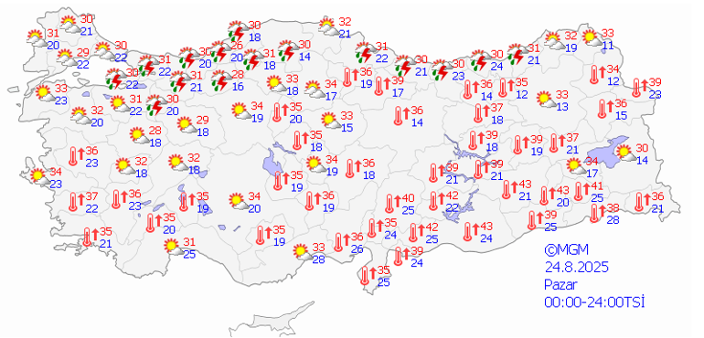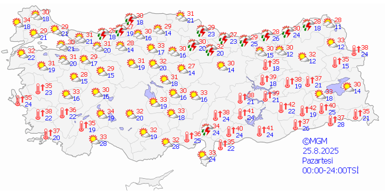 Meteoroloji tarafından aktarılan tahminlere göre, ülkenin kuzeydoğu bölgeleri parçalı ve yer yer çok bulutlu, Orta ve Doğu Karadeniz kıyıları ile Artvin ve Ardahan çevrelerinin yerel iken gök gürültülü sağanak yağışlı, diğer bölgelerin ise az bulutlu ve açık geçeceği öngörülüyor.