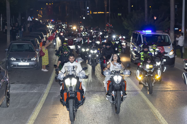 Kortejin en dikkat çekici anlarından biri, yeni evli çiftin katılımıydı. Nikahlarını kıydıktan hemen sonra korteje katılan Cihan Savucu ve Nurgül Gök, gelin aracı olarak süsledikleri motosikletleriyle etkinlikte yer almayı tercih etti. Vatandaşların alkışları eşliğinde, gelinlik ve damatlıkla korteje katılan bu çift, Cumhuriyet coşkusunu kendi mutluluklarıyla harmanlayarak, unutulmaz anlar yaşadı.