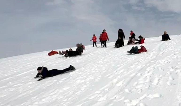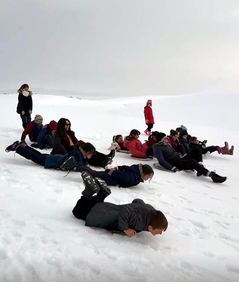 Okulun kapanmasının ardından, 45 öğrenci evlerinden getirdikleri tepsilerle köy merasına çıkarak eğlencenin tadını çıkardı. Meranın zirvesine ulaşan öğrenciler, tepsilerine oturarak yokuştan aşağı kaydılar. Tepsilerle saatlerce kayan çocuklar, kar ve kayak keyfini doyasıya yaşadıklarını belirtti.