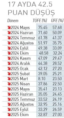 Mayıs 2024'te % 75.45 olan yıllık enflasyon, 15 ay üst üste düşüş göstererek 2025'in Ağustos ayında % 32.95 seviyesine gerilemişti. Eylülde yaşanan geçici artışla % 33.29'a yükselen yıllık enflasyon, ekimde tekrar % 32.87'ye inerek, böylece toplamda 42.58 puan gerilemiş oldu. 2024 yılının ilk 10 ayında enflasyon oranı ise % 28.63 olarak kaydedildi.
