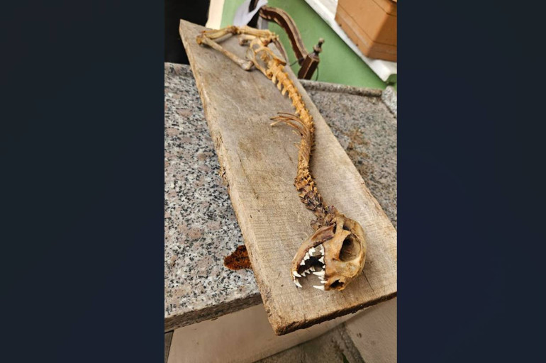 Artvin'in Alanbaşı köyünde eski muhtar Yavuz Turan, ahırındaki malzemelerin üzerini örtmekte kullandığı naylonlar arasında 55 santimetre uzunluğunda, yırtıcı dişlere sahip bir hayvan iskeleti buldu.