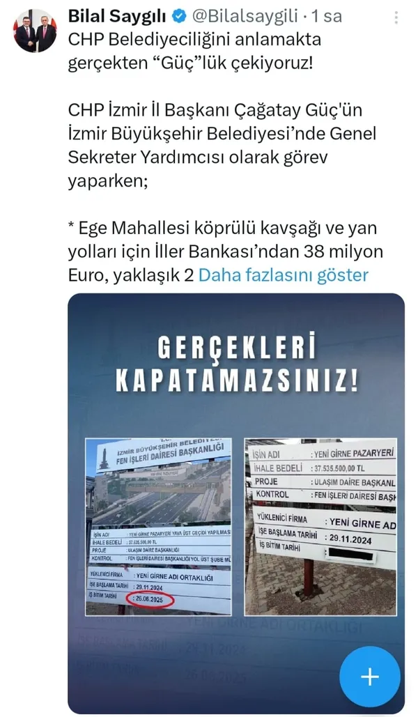 Başkan Saygılı yaptığı açıklamada, “CHP Belediyeciliğini anlamakta gerçekten 'Güç'lük çekiyoruz! CHP İzmir İl Başkanı Çağatay Güç'ün İzmir Büyükşehir Belediyesi'nde Genel Sekreter Yardımcısı olduğu dönemde; Ege Mahallesi köprülü kavşağı ve yan yollar için İller Bankası'ndan 38 milyon Euro, yaklaşık 2 milyar TL'lik, 25 yıl vadeli ve Çevre Bakanlığı garantili bir finansman sağlandı. Bir milyar TL'lik itfaiye araç alımı için yine devletimizin desteği ile kredi temin edildi. Tüm bu büyük projelerin Ankara ile olan görüşmelerinde bizzat yer aldınız. Hükümetimizin İzmir için kaynak ürettiği, projeler için kapıları açtığı ve finansman sağladığı ortada! Diğer tarafta ise neler oldu? Sayın Güç, yine aynı dönemde Genel Sekreter Yardımcısı iken Karşıyaka Yeni Girne Caddesi üzerinde başlatılan üst geçit projesinin sorumlusuydu ve '7 ayda bitecek' demişti. Ancak zaman geçti ve proje tamamlanmadı. Projenin bitiş tarihi tabelasına yazılmıştı, fakat işler rayından çıkınca, o tarih kapatıldı, adeta 'tarih silindi, sorumluluk unutuldu' mesajı verildi. Aradan bir yıl geçti, Sayın Güç koltuk değiştirdi; makamlar, mevkiler el değiştirdi. Ancak o küçük üst geçit hâlâ ortada yok. CHP belediyeciliğinin özeti gibi. Sayın Güç'e tavsiyemiz; önce kendi yarım bıraktığı işlerle ilgilenmesidir” dedi.