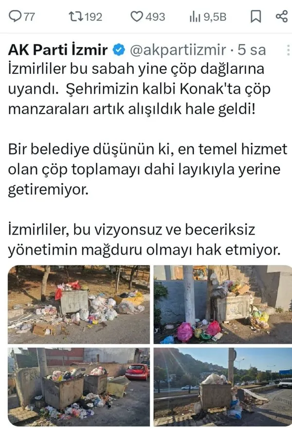 AK Parti İzmir İl Başkanlığı, kent genelindeki çöp sorununa dair bir açıklama yaptı. Partinin sosyal medya hesaplarından, Konak ilçesindeki cadde ve sokaklarda biriken çöplerin fotoğraflarını paylaşarak, “İzmirliler bu sabah yine çöp dağları ile uyandı. Şehrimizin kalbi Konak'ta çöp manzaraları artık alışıldık hale geldi! Bir belediye düşünün ki, en temel hizmet olan çöp toplamayı dahi layıkıyla yerine getiremiyor. İzmirliler, bu vizyonsuz ve beceriksiz yönetimin mağduru olmayı hak etmiyor.” ifadelerine yer verildi.