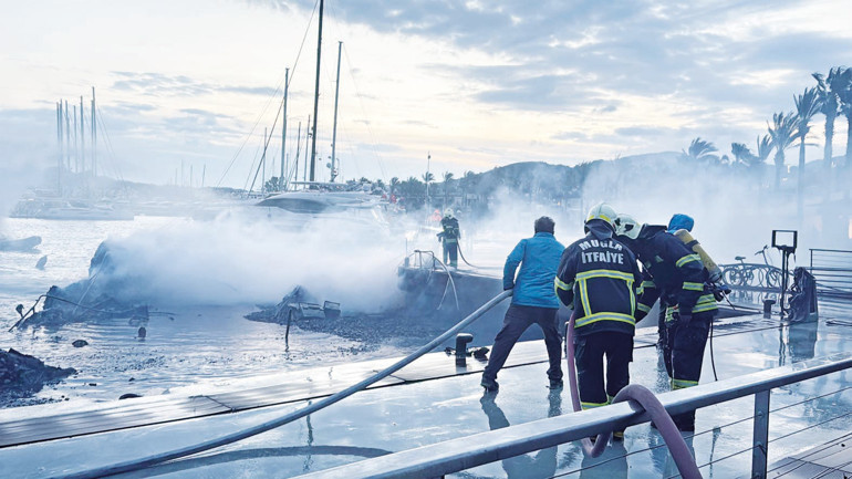 MUĞLA’nın Bodrum ilçesindeki Yalıkavak Mahallesi’nde bulunan bir marinada bağlı motoryatta dün saat 04.00 sıralarında yangın çıktı. Alevler rüzgârın etkisiyle kısa sürede büyüyerek diğer motoryatlara da sıçradı. İhbarla bölgeye itfaiye ekipleri sevk edildi. Bodrum Bölge Liman Başkanlığı’nın talimatıyla Bodrum’dan 1, Güllük’ten ise 2 liman römorkörü ve kıyı emniyetine bağlı römorkörler de bölgeye sevk edildi. Ekipler, karadan ve denizden alevlere müdahale etti. Bodrum Sahil Güvenlik Karakol Komutanlığı ekipleri de denizde önlem aldı. Yangında yanan boyları 20 ila 30 metre arasında değişen 7 motoryat battı, 1’i ise kısmi hasar aldı. Bodrum Belediye Başkanı Tamer Mandalinci, “Yangının çıkış nedenleri daha sonra yapılacak tahkikat sonucu belli olacak” dedi.