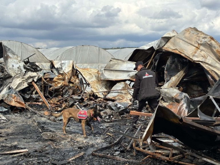 Yangının yaşandığı konteynerde ve çevresinde jandarmaya ait yangın tespiti köpeği eşliğinde kundaklama olup olmadığına dair inceleme yapıldı.