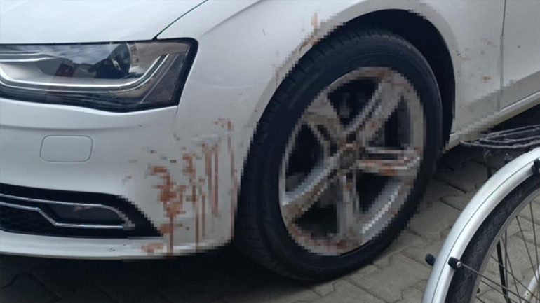 Kısa süre içerisinde otomobilin yanına gelen kadın sürücü, aracını yeni aldığını belirterek, gelenekler gereği otomobili için kesilen adağın kanını çeşitli yerlerine sürdüğünü açıkladı.