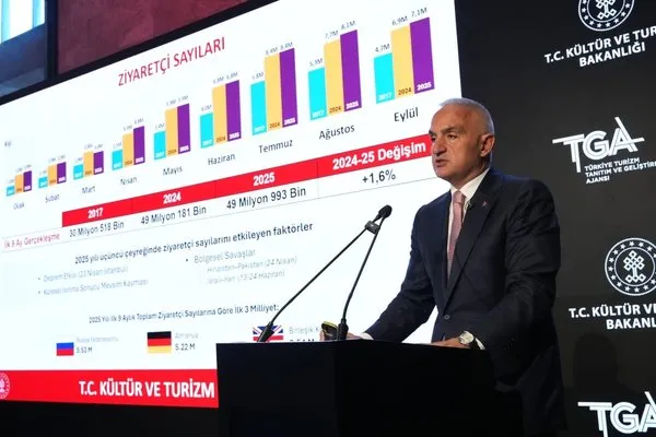 Kültür ve Turizm Bakanı Mehmet Nuri Ersoy, 2025'in ilk 9 ayında elde edilen turizm verilerini Atatürk Kültür Merkezi'nde düzenlediği basın toplantısında duyurdu. Ersoy, 2025 hedefleri arasında yer alan ziyaretçi sayısı ve gelir verilerine ulaşılmaya başlandığını belirtti. Bu yılın ilk dokuz ayında Türkiye'ye gelen ziyaretçi sayısının 49 milyon 993 bine çıktığını kaydederek, “Geçen yıl bu dönemde 49 milyon 181 bin ziyaretçi ağırlamıştık. Yüzde 1,6'lık bir artışla hedeflerimize paralel bir gelişim gösterdik.” dedi.