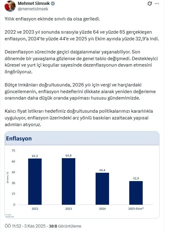 Hazine ve Maliye Bakanı Mehmet Şimşek, yıllık enflasyon oranları hakkında değerlendirmelerde bulundu. Şimşek, “Yıllık enflasyon ekimde az da olsa düştü. 2022 ve 2023 yıllarında sırasıyla yüzde 64 ve yüzde 65 olarak gerçekleşen enflasyon, 2024’te yüzde 44’e ve 2025 yılı ekim ayında yüzde 32,9’a geriledi” ifadelerini kullandı.