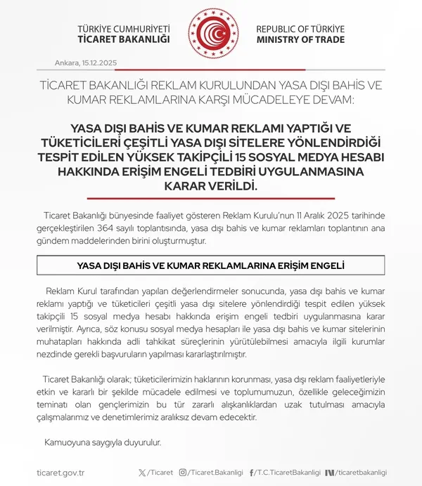 Açıklamada, “Yasa Dışı Bahis ve Kumar Reklamı yaptığı belirlenen ve tüketicileri çeşitli yasa dışı sitelere yönlendiren yüksek takipçili 15 sosyal medya hesabı hakkında erişim engeli tedbiri uygulanmasına karar verilmiştir.” denildi.