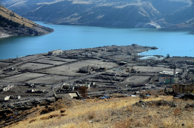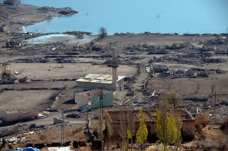 Baraj kapaklarının kısmen açılması ile su seviyesi düşerken, köydeki evler, cami, kilise ve bazı tarihi yapılar yeniden görünür hale geldi.