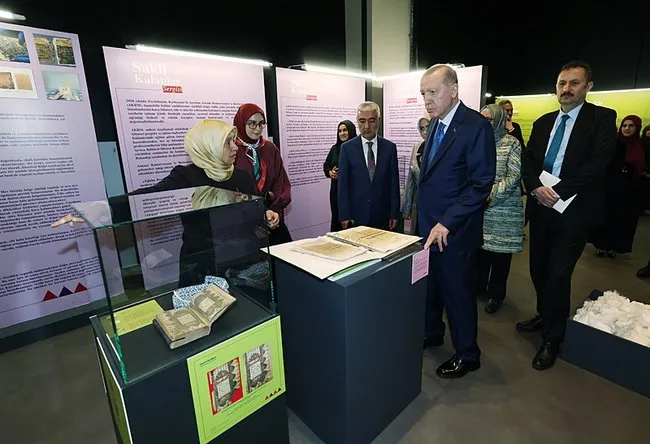 Başkan Recep Tayyip Erdoğan, eşi Emine Erdoğan tarafından açılışı yapılan ve Kahramanmaraş’ta ortaya çıkan 40 kitabın sergilendiği “Saklı Kalanlar” sergisini gezdi. Bu etkinlik, restorasyon sürecinde yerli el yapımı kağıtların kullanılmasıyla Türkiye’de bir ilki temsil ediyor.