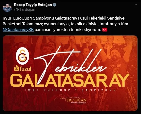 Erdoğan, sosyal medya hesabından yaptığı paylaşımda, “IWBF EuroCup 1 Şampiyonu Galatasaray Fuzul Tekerlekli Sandalye Basketbol Takımımızı, oyuncularıyla, teknik ekibiyle, taraftarıyla tüm Galatasaray Spor Kulübü camiasını yürekten tebrik ediyorum.” ifadelerini kullandı.