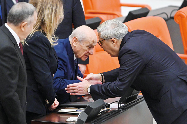 Bütçe görüşmeleri başlamadan önce tüm genel başkanlar birbirleriyle tokalaşarak salona girdi. MHP Lideri Bahçeli salona ilk giren genel başkan oldu. Ardından İYİ Parti Genel Başkanı Dervişoğlu ve DEM Parti Eş Genel Başkanları Hatimoğulları ile Bakırhan Bahçeli’nin yanına giderek tokalaştı. CHP Lideri Özel de salona girerek diğer liderlerle selamlaştı.
