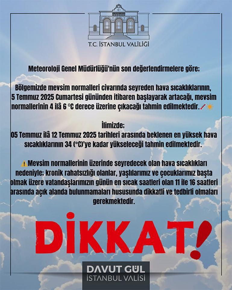 Açıklamada, İstanbul'da 5 ile 12 Temmuz arasında hava sıcaklığının 34 dereceye kadar yükselebileceği belirtildi ve “Kronik rahatsızlığı olanlar, yaşlılarımız ve çocuklarımız başta olmak üzere, vatandaşlarımızın günün en sıcak saatleri olan 11:00 ila 16:00 arasında açık alanda bulunmamaları hususunda dikkatli ve tedbirli olmaları gerekmektedir.” denildi.