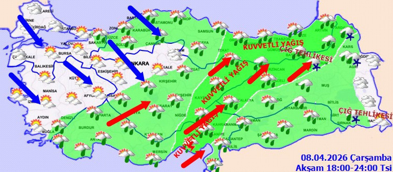 Yağışların; Doğu Akdeniz, Doğu Karadeniz, Doğu Anadolu'nun kuzeyi ile Kayseri, Sivas, Malatya, Muş ve Bingöl çevrelerinde yerel olarak kuvvetli bekleniyor.
