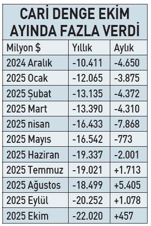 Cari işlemler hesabında altın ve enerji hariç, ekim ayında 7 milyar 28 milyon dolarlık bir fazla oluştu. Bu dönemde, ödemeler dengesi tanımlı dış ticaret açığı ise 5 milyar 963 milyon dolar olarak kaydedildi. Yıllıklandırılmış verilere göre, ekim ayında cari açık yaklaşık 22 milyar dolara ulaşırken, ödemeler dengesi tanımlı dış ticaret dengesi de 67.3 milyar dolar açık verdi. Cari dengenin ekim ayında fazla vermesiyle, cari işlemler hesabı üst üste dördüncü ayda da pozitif bir seyir izledi. Temmuz, ağustos, eylül ve ekim aylarını kapsayan dört aylık süre zarfında toplam cari fazla 8 milyar 653 milyon dolara ulaştı.
