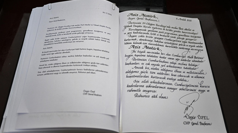 “Partimizin 39'uncu Olağan Kurultayı'nda seçilen Parti Meclisi ve Yüksek Disiplin Kurulu üyelerimiz ile birlikte yeniden huzurunuzdayız. Kurultayımızda yenilenen parti programımız, güncellenen tüzüğümüz ve yeni kadrolarımızla, birlik ve beraberlik içinde geleceğe yürüyoruz. Bugün çoklu krizler yaşayan Cumhuriyetimizi, çağın kuşatmasından kurtarmak; demokrasiyi, hukukun üstünlüğünü, gelirde ve vergide adaleti hakim kılmak için mücadelemizi kararlılıkla sürdüreceğimize söz veriyoruz. Aziz Atatürk; iki büyük eserinizden biri olan Cumhuriyet Halk Partimiz bugün kapatma tehdidine kadar varan ağır saldırılar altındadır. Partimizin Cumhurbaşkanı adayı, seçilmiş belediye başkanları ve çok sayıda yol arkadaşımız tutukludur. Ancak biz, sizden aldığımız ilham ve milletimizden aldığımız güçle tüm saldırıları boşa çıkaracak ve ülkemizi kuşatmalardan kurtaracak iradeye sahibiz. Size, silah arkadaşlarınıza, Cumhuriyetimizin kurucu kadrolarına şükranlarımızı sunuyor; şehitlerimizi saygı ve rahmetle anıyoruz. Ruhunuz şad olsun.”