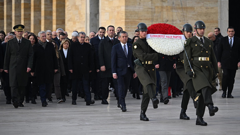 CHP Genel Başkanı Özgür Özel'in başkanlığındaki heyet, Aslanlı Yol'dan ilerleyerek Ulu Önder Mustafa Kemal Atatürk'ün mozolesine ulaştı. Özel, burada mozoleye çelenk bıraktıktan sonra saygı duruşunda bulundu.