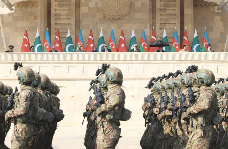 – Türkiye'nin 2. Karabağ Savaşı süresince verdiği desteğin bir sembolü olarak Cumhurbaşkanlığı Muhafız Alayı Tören Birliği Komando Taburu da geçitte yer aldı. İki ülke askerlerinin adımlarındaki uyum, izleyenler tarafından uzun süre alkışlandı. 2. Karabağ Savaşı gazileri, büyük bir coşkuyla meydandan geçti.
