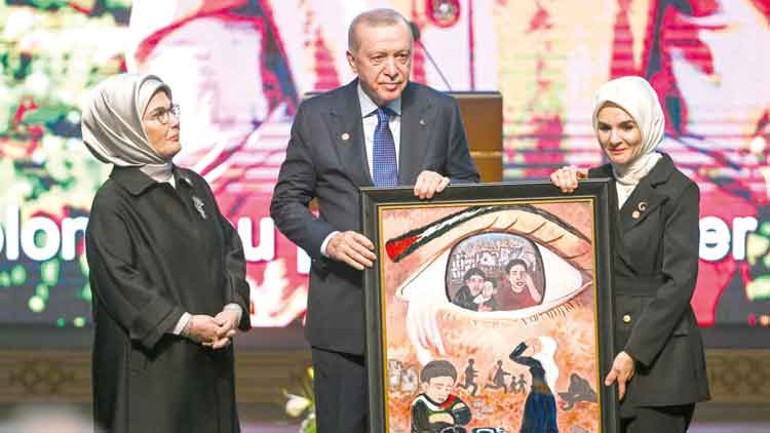 Programda Aile ve Sosyal Hizmetler Bakanı Mahinur Özdemir Göktaş, Cumhurbaşkanı Erdoğan’a Filistinli kadın ressam Yasemin Esad Ebu Muhaysin’in “Hayatta Kalanların Gözyaşları” adlı tablosunun replikasını takdim etti. Bu eser, Gazze’deki insani durumu gözler önüne seriyor.