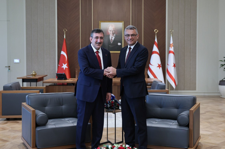 Cumhurbaşkanı Yardımcısı Cevdet Yılmaz, KKTC Cumhurbaşkanlığı Yerleşkesi'nde düzenlenen devir teslim töreninin ardından, KKTC'nin 6. Cumhurbaşkanı Tufan Erhürman ile makamında bir araya geldi.