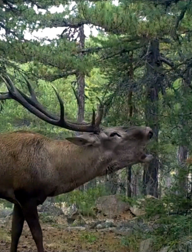 İri cüssesi ve uzun boynuzlarıyla görüntülenen geyiğin, gür sesi de fotokapan tarafından kaydedildi.