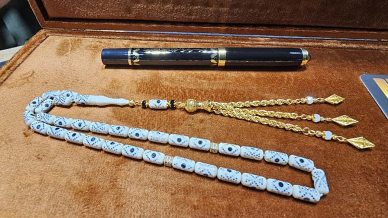 Tespih hakkında bilgi veren Hadin Bulut, “Dünyanın en değerli iki madenini orijinal bir fil dişinde bir araya getirdik. Pırlanta ile altının fil dişinin üzerindeki muazzam görsel uyumunu sağladık. Tamamen özel sipariş olarak üretildi. 3,5 karat pırlanta ve 5.97 gram 14 ayar altın kullanıldı. Fil dişinin de 20 grama yakın malzemesi bulunuyor.