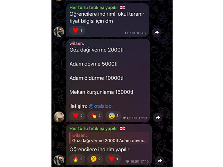 Grupta “Barış Çelik” ismiyle yazan kullanıcının, “Yarına bir sürü müşteri çıktı. Okullara saldırılara düzenleyeceğiz” mesajı dikkat çekerken, bir başka kullanıcı ise, “İşler açıldı. Her türlü okul basılır” ifadesi dikkat çekti. Grupta saldırılar için fiyat tarifesi paylaşıldığı da görüldü.
