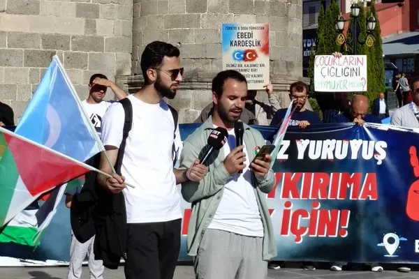 Kent merkezindeki Lala Mustafa Paşa Cami önünde bir araya gelen sağlık çalışanları, doktorlar ve tıp fakültesi öğrencileriyle birlikte Türk, Filistin ve Doğu Türkistan bayrakları eşliğinde, taşıdıkları döviz ve pankartlarla Yakutiye Medresesi’ne kadar yürüyüş gerçekleştirdi. Atatürk Üniversitesi Tıp Fakültesi öğrencisi Hakan Sümbül, burada buluşmalarının bir vicdan çağrısı olduğunu belirtti.
