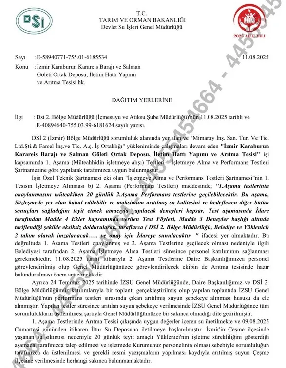 'Resmi DSİ belgesi ve gerçekler' başlığı altında açıklamalarına devam eden İnan, şu ifadeleri kullandı: “24 Temmuz 2025: DSİ–İZSU toplantısında, arıtılmış suyun şebekeye verilmesi için tek şartın İZSU'nun sorumluluk alması gerektiği belirtilmiştir. 9 Ağustos 2025: Arıtılmış su İltur Deposu'na iletilmeye başlandı. 11 Ağustos 2025: İlk aşama testleri DSİ tarafından onaylandı. Aynı tarihte ikinci aşama performans testleri başlamıştır. DSİ, 'İZSU sorumluluk alırsa Çeşme'ye su verilebilir' diye yazılı olarak bildirilmiştir. Arıtma tesisinden çıkan su, DSİ standartlarında ve içme suyu kalitesindedir.” diye konuştu.