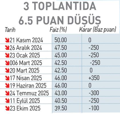 Aralık 2024'te başladığı faiz indirim döngüsüne Mart 2025'te ara veren Türkiye Cumhuriyet Merkez Bankası (TCMB), nisanda gerçekleştirdiği 350 baz puanlık artırımın ardından temmuzda tekrar indirim sürecine geçti. Merkez Bankası Başkanı Fatih Karahan başkanlığındaki Para Politikası Kurulu (PPK), bir hafta vadeli repo ihale faiz oranını yüzde 40.5'ten 39.5'e düşürme kararı aldı. Böylece politika faizi Ekim 2023'ten beri ilk defa % 40'ın altına inmiş oldu.