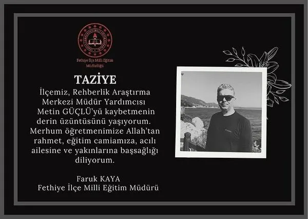 Fethiye’nin Söğütlü mahallesinde yaşayan evli ve iki çocuk babası rehberlik öğretmeni Metin Güçlü, 50 yaşında hayatını kaybetti.