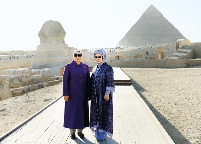 CUMHURBAŞKANI Erdoğan’ın eşi Emine Erdoğan, Mısır Cumhurbaşkanı Abdulfettah es-Sisi’nin eşi Entissar Amer ile ikili bir görüşme gerçekleştirdi. Görüşmenin ardından lider eşleri, antik Mısır’a dair nadir eserleri barındıran Büyük Mısır Müzesi’ni ziyaret etti. Antik Mısır uygarlığına ait 18. Firavun Hanedanlığı'ndan Kral Tutankamon’un altın ölüm maskesi, mücevherleri, savaş arabaları ve günlük yaşam eşyalarının bulunduğu koleksiyonu inceleyen lider eşleri, 2. Ramses heykeli önünde hatıra fotoğrafı çektirdi. Ziyaretin ardından lider eşleri, Giza Piramitleri’ni de gezdi.
