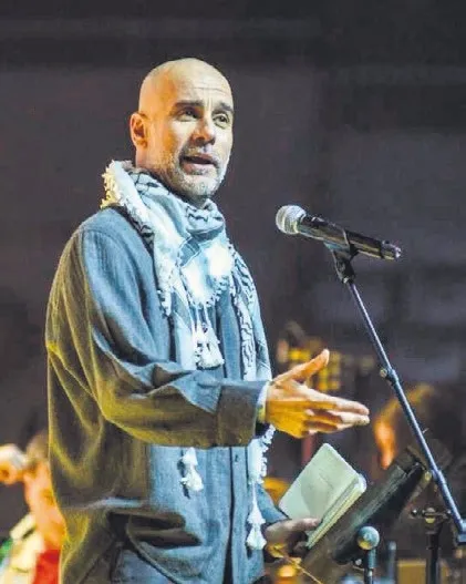 Kefiye takarak kürsüye çıkan Guardiola, sözlerinin ardından büyük alkış aldı.