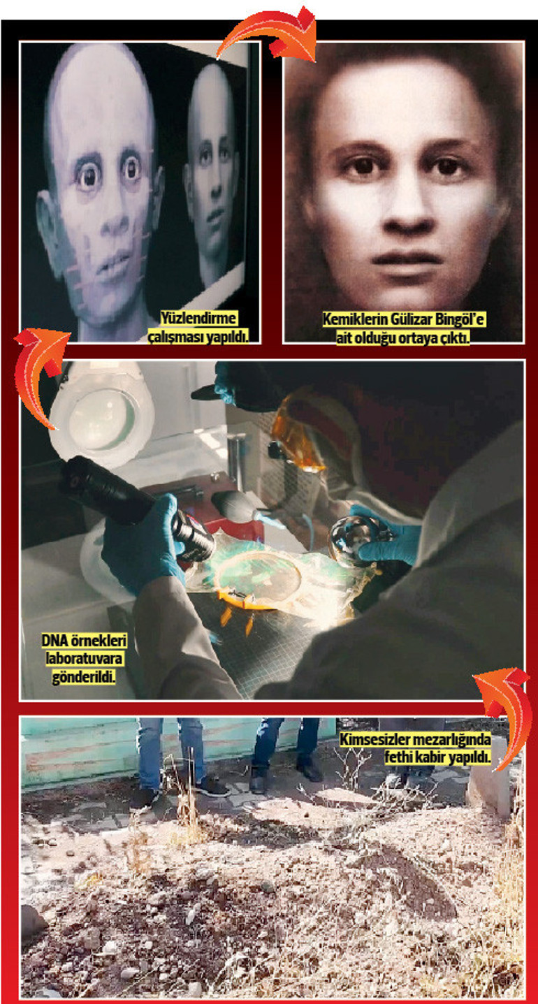 Olay yeri ve mezardaki kemiklerden alınan örnekler, Ankara Emniyet Genel Müdürlüğü Bölge Kriminal Polis Laboratuvarı'nda incelendi. Yüzlendirme işlemleri sonucunda cesedin, 10 yıl önce kaybolan 3 çocuk annesi Gülizar Bingöl'e ait olduğuna ulaşıldı. HTS analizleri, Bingöl'ün olay günü akrabası Mehmet Biroğlu ile sürekli iletişimde olduğunu ortaya koydu. Bunun üzerine Biroğlu, ekipler tarafından gözaltına alındı. Olay yerinden elde edilen DNA örnekleri, Biroğlu’ndan alınan örneklerle eşleşti. Gözaltına alınan Biroğlu, adliyeye sevk edilmesinin ardından mahkeme tarafından tutuklanarak cezaevine gönderildi.