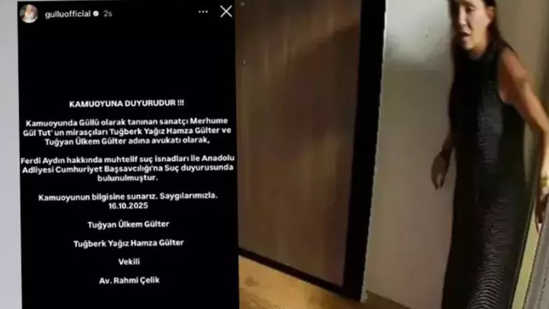 “Kamuoyunda Güllü olarak bilinen sanatçı merhume Gül Tut'un mirasçıları olan Tuğberk Yağız, Hamza Gülter ve Tuğyan Ülkem Gülter adına avukati olarak Ferdi Aydın hakkında çeşitli suçlamalarla Anadolu Adliyesi Cumhuriyet Başsavcılığı’na suç duyurusunda bulunulmuştur. Kamuoyunun bilgisine sunarız. Saygılarımızla. 16.10.2025 Tuğyan Ülkem Gülter Tuğberk Yağız Hamza Gülter Vekili Av. Rahmi Çelik.”