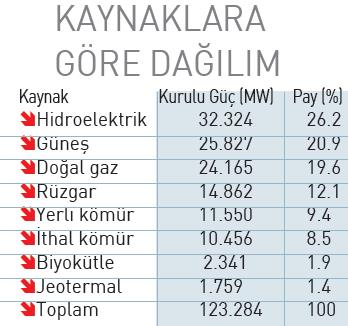 Ocak ayı itibarıyla Türkiye'nin elektrik kurulu gücü, 123 bin 284 megavata ulaştı. Güneş ve rüzgâr güç santrallerinin toplam kurulu gücü ise 40 bin 689 megavat oldu. Enerji ve Tabii Kaynaklar Bakanlığı'nın açıkladığı verilere göre, toplam elektrik kurulu gücünün %62.5'i olan 77 bin 114 megavat, yenilenebilir enerji kaynaklarından elde ediliyor.