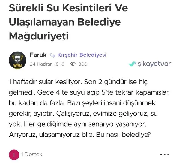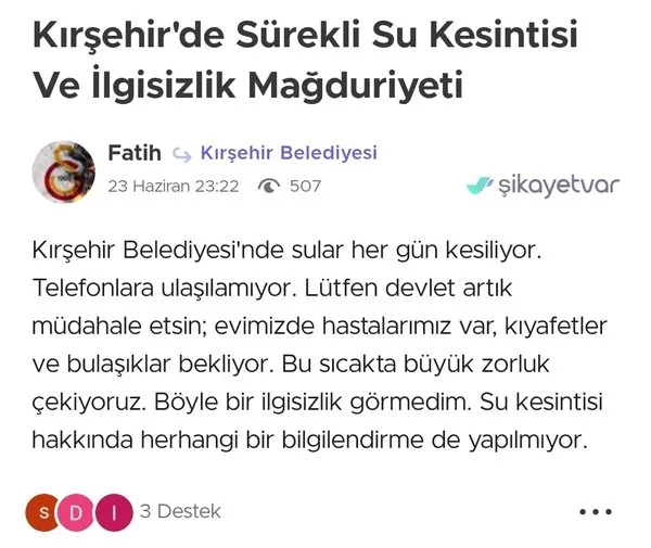 Belediye Başkanı Selahattin Ekicioğlu'na yönelik tepkiler giderek artarken, “Bu sorumsuzluğun cezasını biz çekiyoruz” diyerek şikâyetlerini dile getiren vatandaşlar, belediyede muhatap bulmakta zorlandıklarını belirtiyor. Kentteki su krizine karşı belediyenin kayıtsız kaldığını ifade eden vatandaşlar, yaşadıkları sıkıntıları sosyal medya aracılığıyla paylaşarak seslerini duyurmaya çalışıyor.