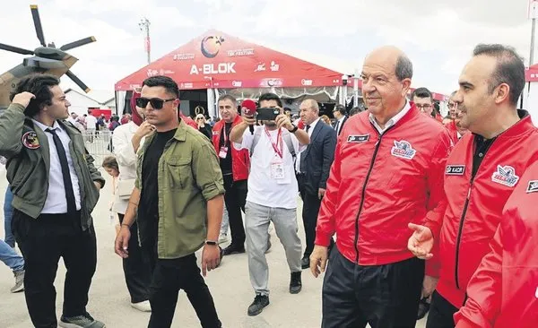 Törende, Kuzey Kıbrıs Türk Cumhuriyeti (KKTC) Cumhurbaşkanı Ersin Tatar, TEKNOFEST Yönetim Kurulu ve T3 Vakfı Mütevelli Heyeti Başkanı Selçuk Bayraktar ile protokol üyeleri, Türk ve Kıbrıs bayrakları eşliğinde katılımcıları selamladı.