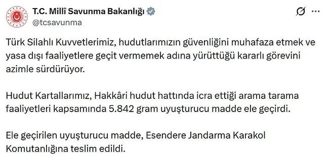 Milli Savunma Bakanlığı'nın sosyal medya üzerinden yaptığı açıklamaya göre, Türk Silahlı Kuvvetleri, sınır güvenliğini sağlamak ve yasa dışı faaliyetlere engel olmak için kararlılıkla görev yaptığına dikkat çekildi.