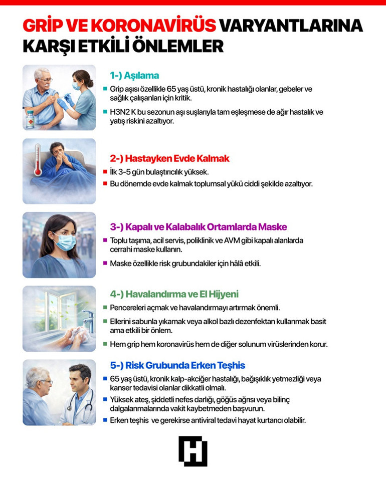 Dr. Süleyman Alpar, H3N2 alt soyunun öldürücü olduğuna dair net bir kanıt bulunmadığını ancak daha hızlı yayıldığını sözlerine ekledi. “Özellikle yaşlılar, kronik hastalığı olanlar ve bağışıklık sistemi baskılanmış kişilerde hastaneye yatış ihtiyacını artırabiliyor” ifadesini kullandı ve ekledi: