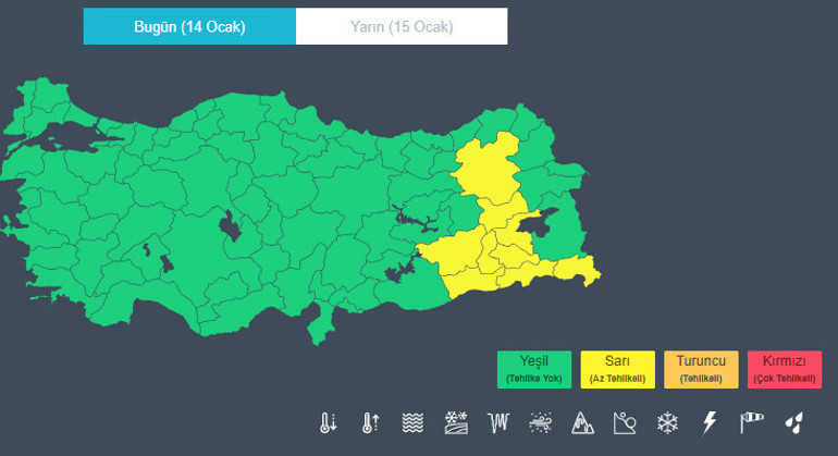 Meteorolojinin sarı kodlu uyarı verdiği iller: Bitlis, Diyarbakır, Erzurum, Hakkari, Mardin, Muş, Siirt, Batman ve Şırnak.