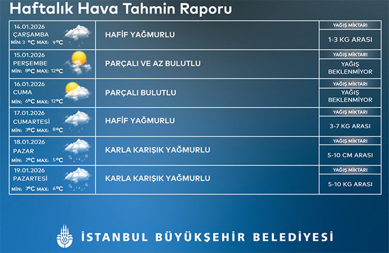Hafta başında İstanbul, kar yağışı ile kaplandı ancak etkisi kısa sürdü. Meteoroloji Genel Müdürlüğü tarafından yapılan yeni tahminlere göre, İstanbul'a yeniden kar bekleniyor. Ülke genelinde sıcaklıkların hafta sonuna kadar 12 derecelere çıkması, hafta sonunda ise yeni bir soğuk hava dalgası ile birlikte sıcaklıkların toplamda 5 derece düşeceği belirtildi. Pazar günü İstanbul'da kar yağışının yeniden etkili olması, pazartesi günü de devam etmesi öngörülüyor.