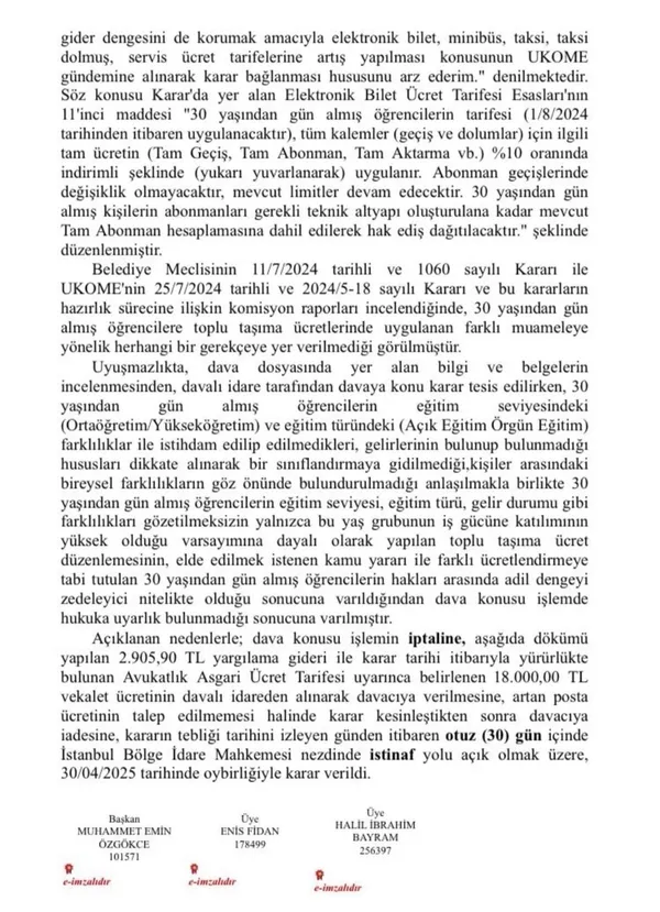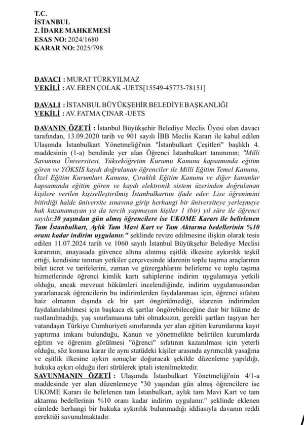 İstanbul Büyükşehir Belediye (İBB) yönetiminin, 11 Temmuz 2024 tarihinde gerçekleşen meclis oturumunda 30 yaşından büyük öğrencilerin İstanbulkart indirim oranlarının yüzde 10'a düşürülmesine ilişkin aldığı karar İstanbul 2'nci İdare Mahkemesi tarafından iptal edildi.