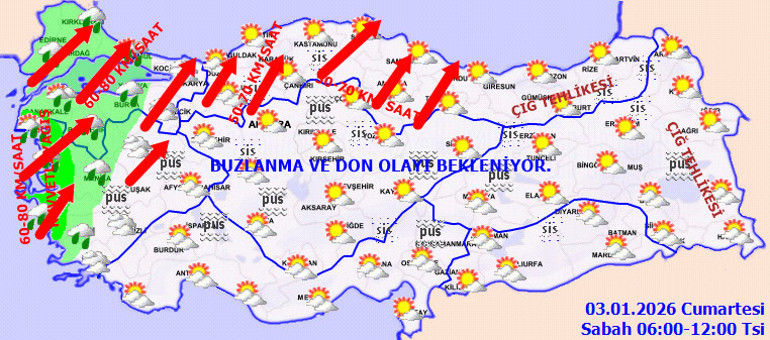 Sabah ve gece saatlerinde İç Ege, İç Anadolu, Karadeniz’in iç kesimleri, Doğu Anadolu ve Güneydoğu Anadolu'nun kuzeyinde buzlanma ve don, ayrıca pus ve yer yer sis görülebilir. Doğu Karadeniz'in yükseklerinde ve Doğu Anadolu'nun doğusundaki yüksek alanların eğimli kesimlerinde çığ tehlikesi bulunuyor.