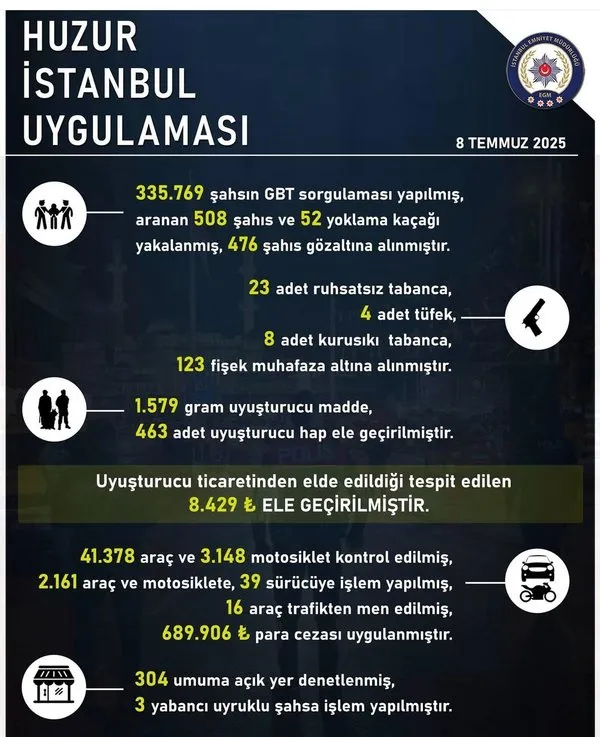 Ekipler, 304 umuma açık iş yerini denetlerken, 3 yabancı uyrukluya işlem uyguladı. Trafik denetimi kapsamında ise 41 bin 378 araç ve 3 bin 148 motosiklet kontrol edildi. 2 bin 161 araç ve motosiklet için işlem yapıldı ve 39 sürücüye ceza kesildi. Denetimler sonucunda 16 araç trafikten men edildi ve 689 bin 906 lira trafik cezası uygulandı.