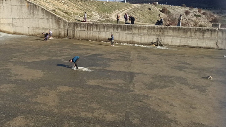 Barajın savak kısmından taşan sular, çevresinde bulunan balıkların geniş bir alana yayılmasına neden oldu.